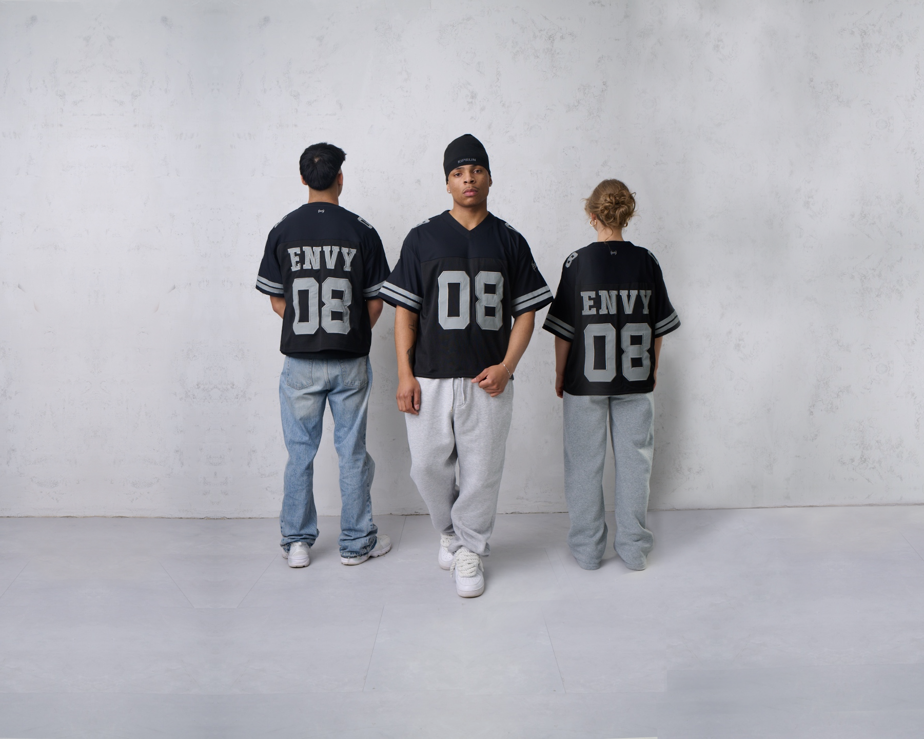 Our latest creation, the ENVY 08 Jersey, fuses sportswear attitude with streetwear edge. With bold block numbers, striped sleeves, and the iconic ‘ENVY’ lettering on the back, it’s designed to make a statement both on the streets and beyond.